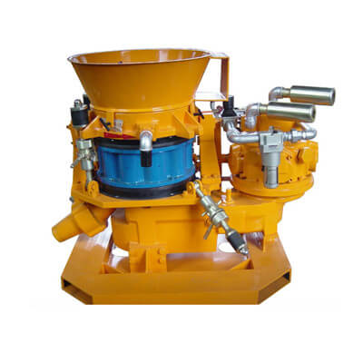 Dry shotcrete machine for underground coal is mainly composed of driving device, rotor assembly, air duct system, injection system, electrical control box and other parts. The agitated material first enters the jet hopper through the vibrating screen, and is moved by the shifter or injected into the straight-through cavity of the rotor by wind pressure, and then goes to the outlet with the rotor. Compressed air entering from the air chamber, Blow the material into the discharge elbow; the cyclone introduces another pressure air, which is a multi-head spiral wind beam to blow the material, accelerate, rotate and float, enter the conveying pipe, and reach the nozzle. Add a small amount of supplementary water (when spraying wet) or liquid quick-setting agent (when spraying wet) to spray out.